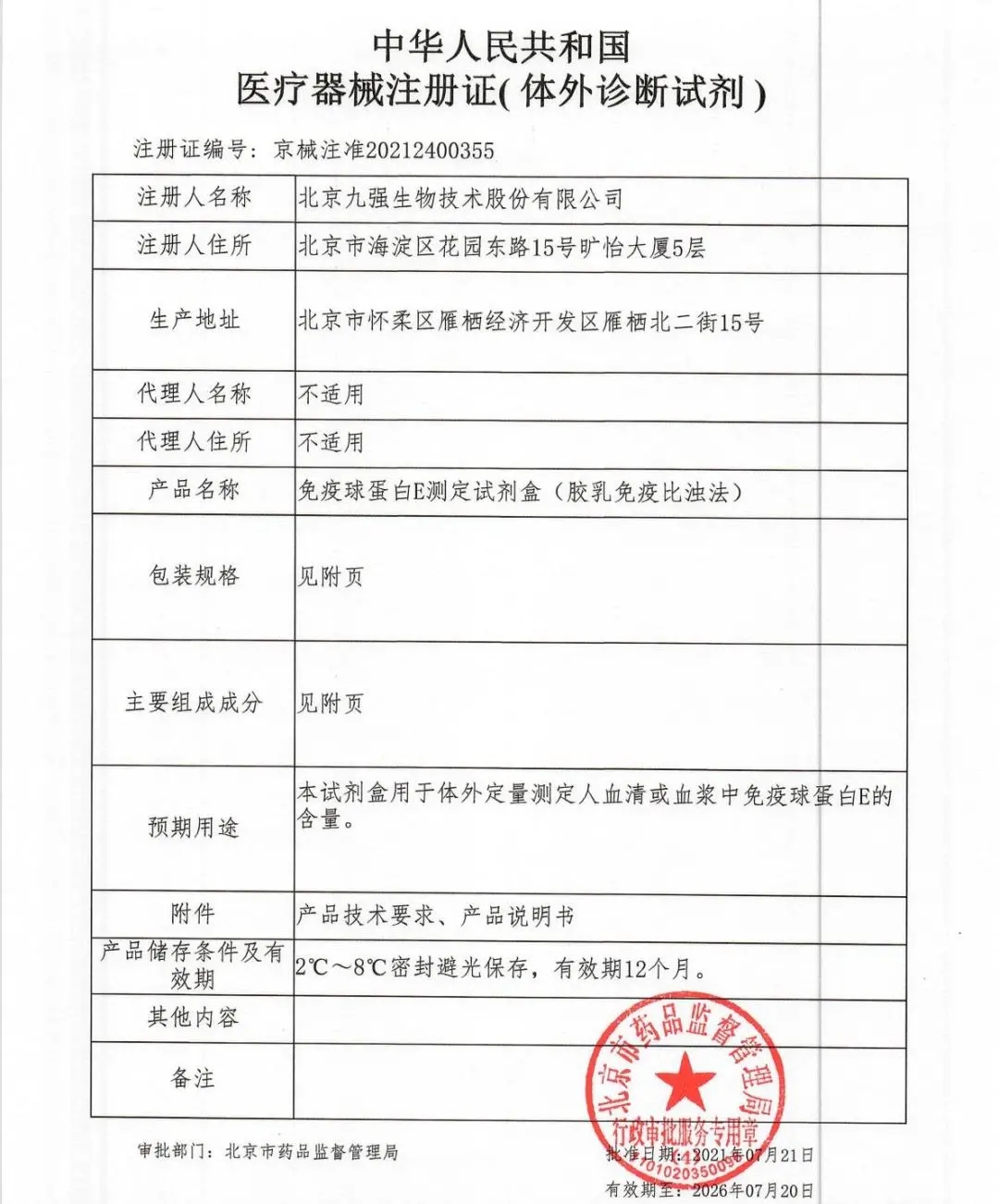 九強生物順利取得國家藥品監(jiān)督管理局頒發(fā)的免疫球蛋白E測定試劑盒(膠乳免疫比濁法)的《醫(yī)療器械注冊證》。